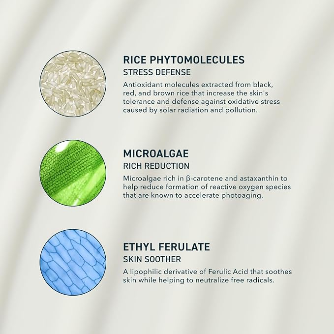 - ANTIOXIDANT SUPPORT: Rice phytomolecules boost skin resilience to UV and environmental stressors, while Microalgae, rich in ฮฒ-carotene and astaxanthin, support visible skin improvements caused by photoaging. Ethyl Ferulate soothes while targeting impurities for healthier-looking skin