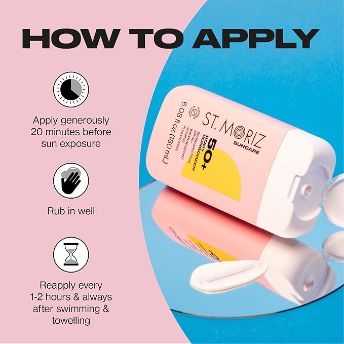 - HOW TO USE: Apply liberally 15 minutes before sun exposure. Reapply: After 80 minutes of swimming or sweating. Immediately after towel drying. At least every 2 hours.Being safe in the sun shouldn't be boring! Our daily use, broad spectrum protection formulas combine sunscreen & skincare to future-proof your skin! Use St. Moriz Suncare alongside St. Moriz Self Tan for a sun safe glow.