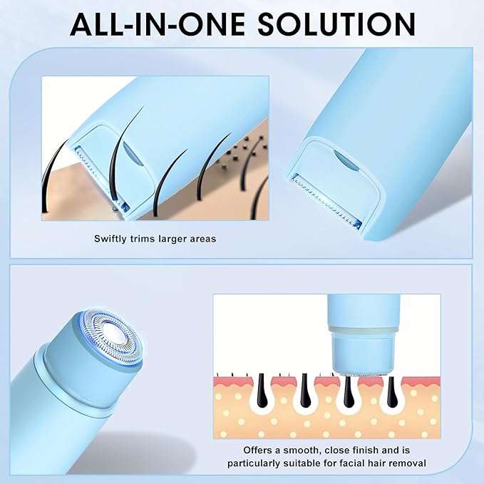 - ✅ 2-in-1 Dual Head Design – This electric razor for woman stands out for its innovative double headed design which combines a bikini shaver for woman and a facial hair trimmer in one, so no need to change heads. Press the switch once to start the bikini shaver or press twice to start the facial trimmer, very easy to use