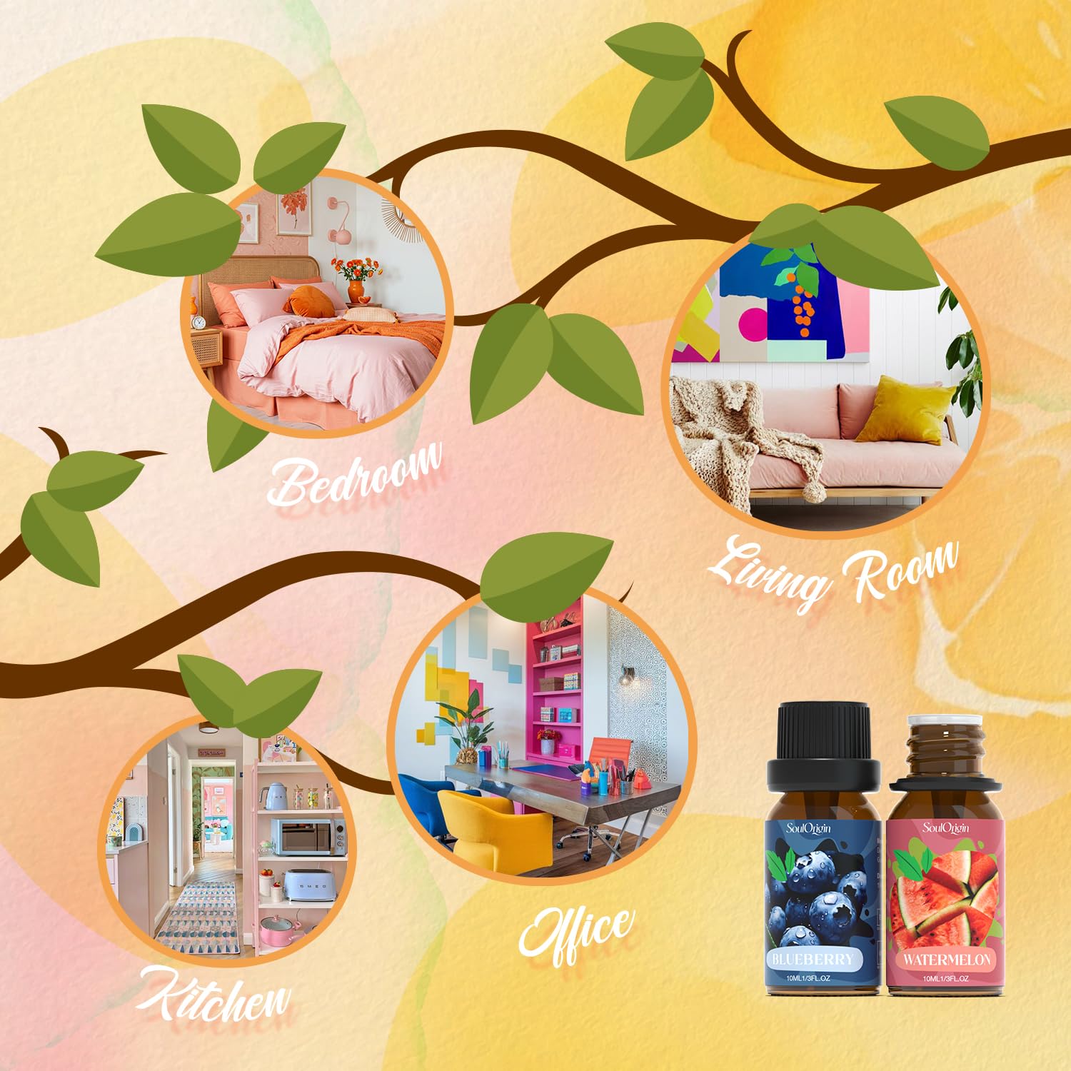 - Brighten Your Space: Add a splash of sunshine to your day with fruit essential oil blends that fill your home with cheerful, uplifting aromas. Perfect for creating a joyful, energizing environmentโthese fruity scents are ideal for kitchens, living rooms, bathrooms, and anywhere you want to feel refreshed.