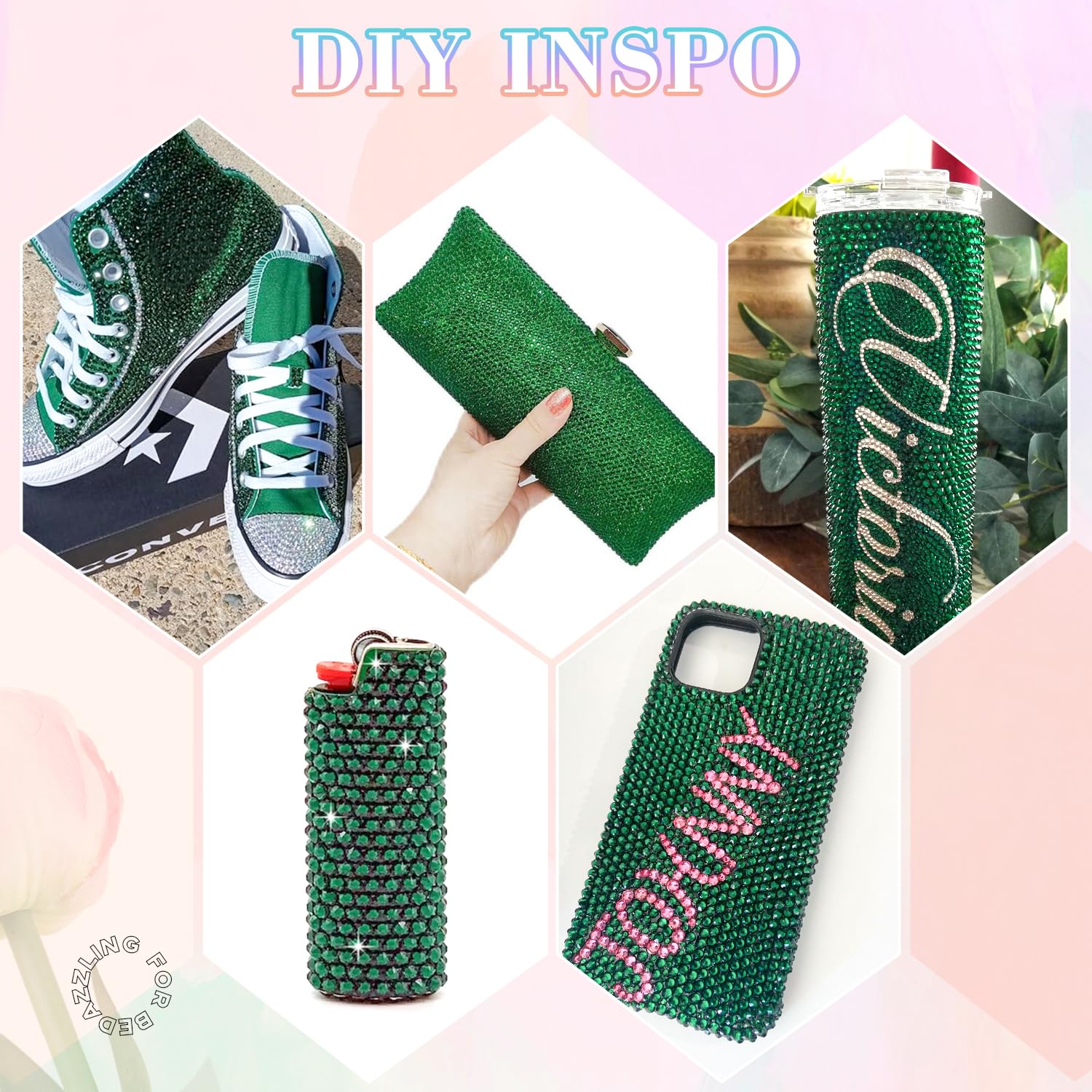 - PACKAGE CONTENT โ This all-in-one bedazzler kit includes everything you need to start creating dazzling designs: 1 box of Emerald Green rhinestones with 24 grids (approx. 30,000 pcs of bedazzling rhinestones assorted size SS6/10/16/20/30 ), 1 precision tweezers, 1 pickup pen for handling small gems, and 3 tubes of B7000 jewelry glue for secure application.