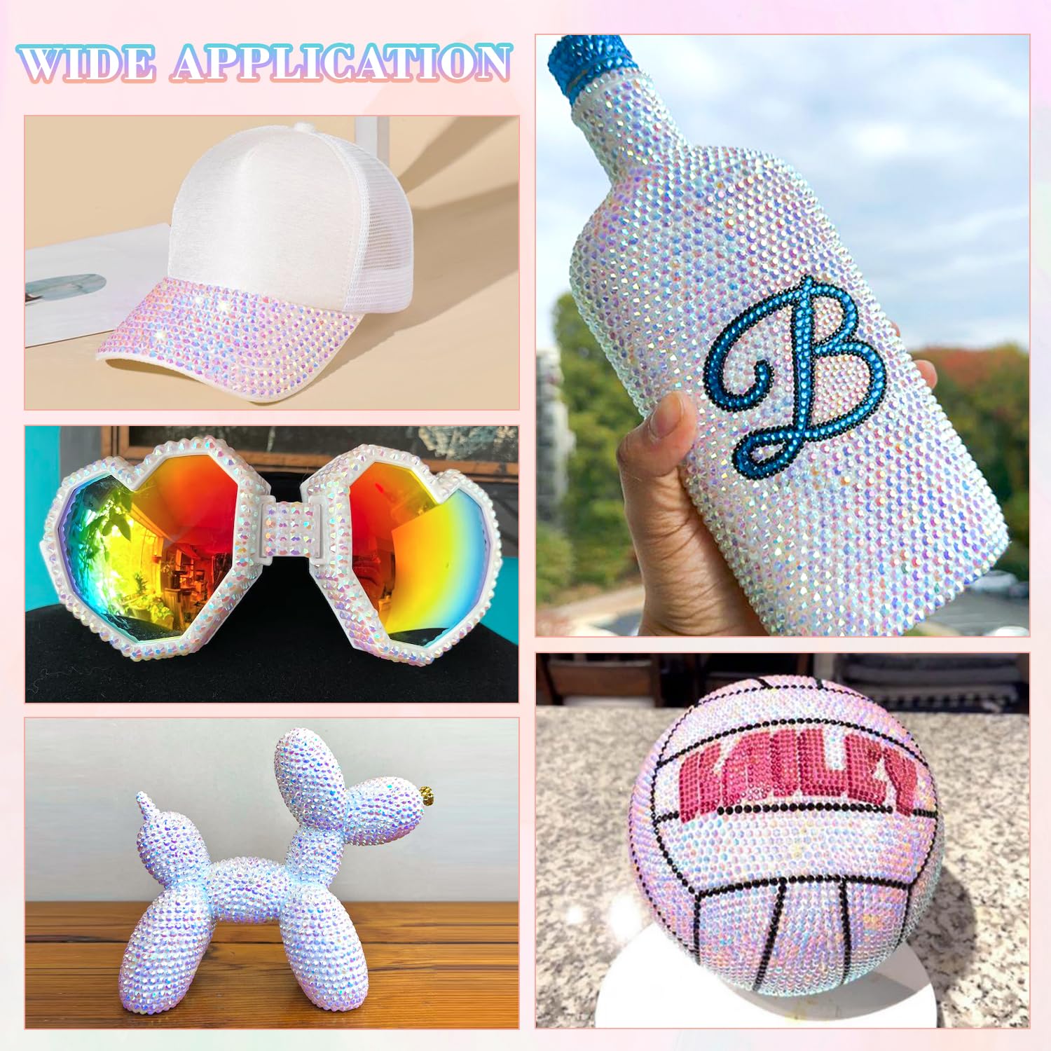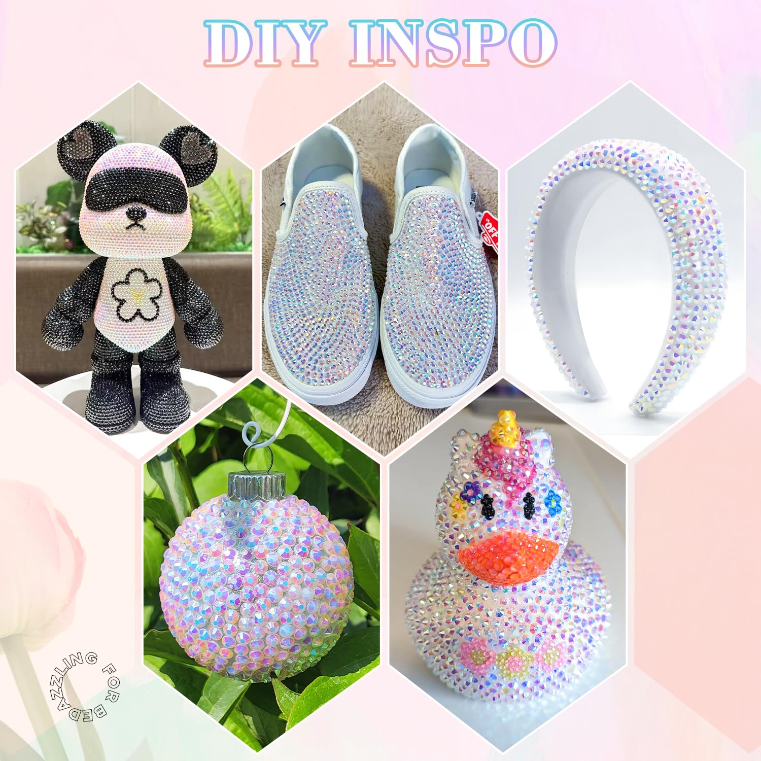 - PACKAGE CONTENT โ This all-in-one bedazzler kit includes everything you need to start creating dazzling designs: 1 box of White AB rhinestones with 24 grids (approx. 30,000 pcs of bedazzling rhinestones assorted size SS6/10/16/20/30 ), 1 precision tweezers, 1 pickup pen for handling small gems, and 3 tubes of B7000 jewelry glue for secure application.