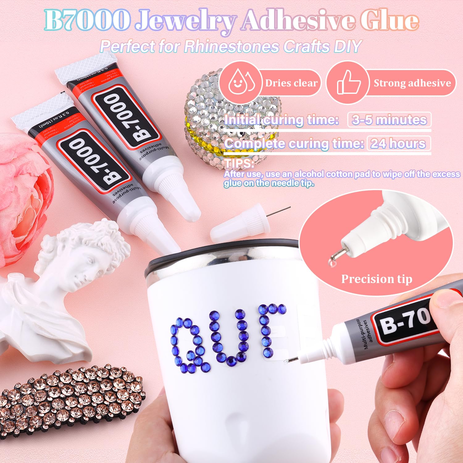 - STRONG B7000 GLUE FOR GEMS โ B7000 glue offers strong, long-lasting adhesion and dries clear, making it perfect for securing gemstones and other embellishments. The precision needle tip allows for controlled, mess-free application. For best results, clean the needle with an alcohol wipe after each use to prevent clogging and ensure smooth flow every time.