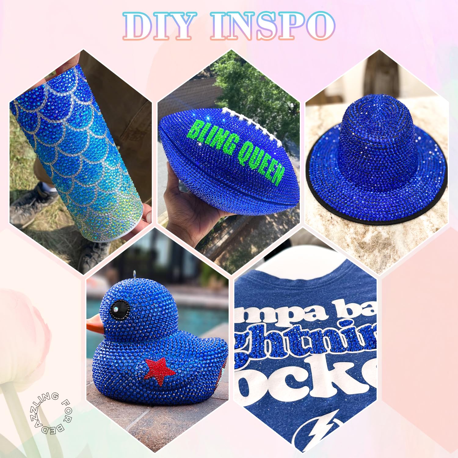 - PACKAGE CONTENT โ This all-in-one bedazzler kit includes everything you need to start creating dazzling designs: 1 box of Royal Blue rhinestones with 24 grids (approx. 30,000 pcs of bedazzling rhinestones assorted size SS6/10/16/20/30 ), 1 precision tweezers, 1 pickup pen for handling small gems, and 3 tubes of B7000 jewelry glue for secure application.