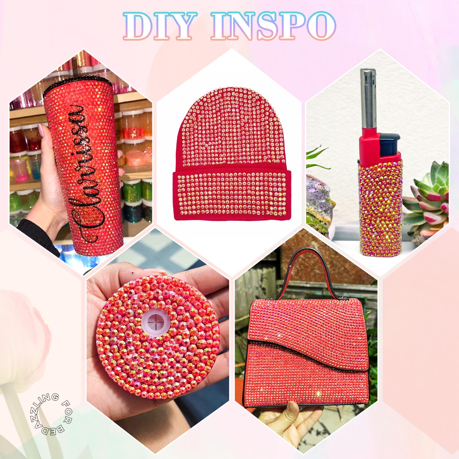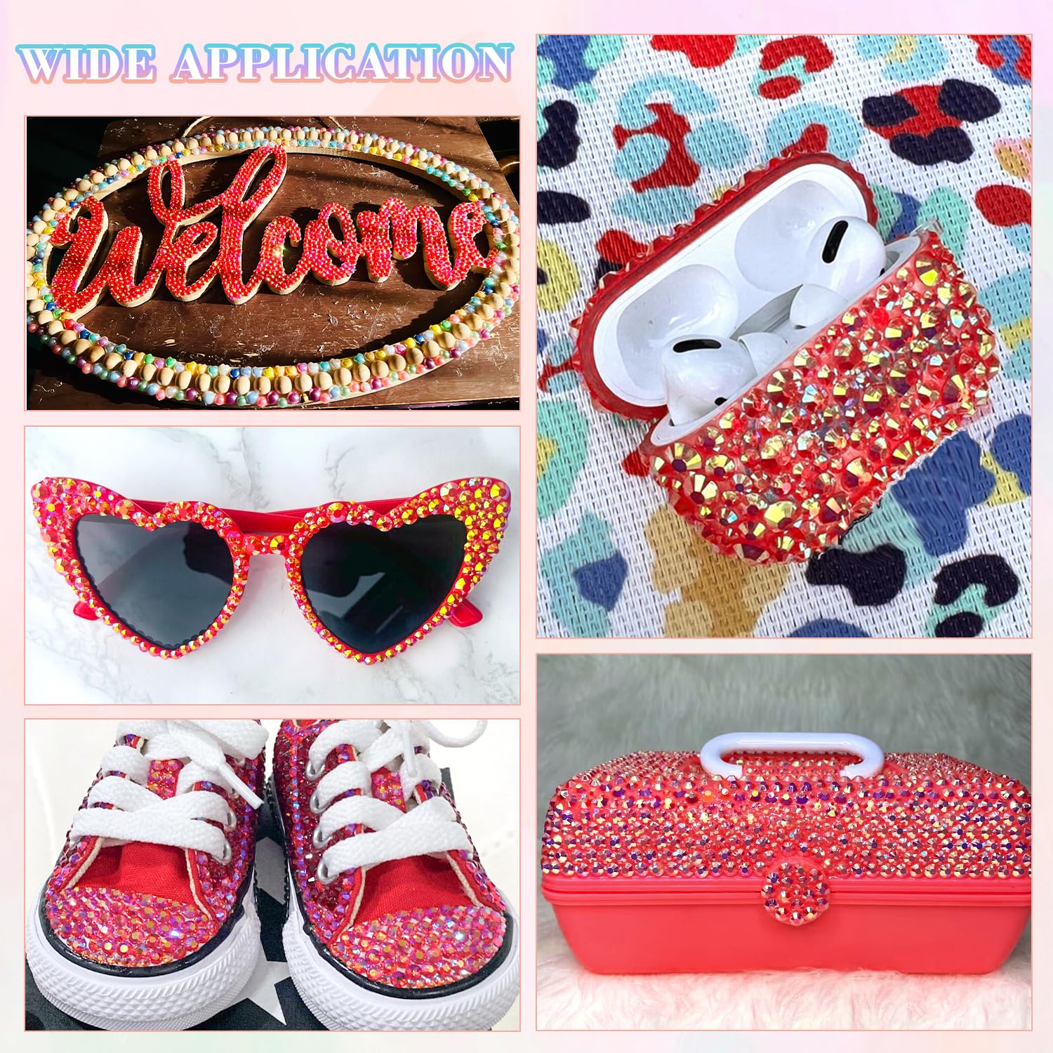 - PACKAGE CONTENT โ This all-in-one bedazzler kit includes everything you need to start creating dazzling designs: 1 box of Red AB rhinestones with 24 grids (approx. 30,000 pcs of bedazzling rhinestones assorted size SS6/10/16/20/30 ), 1 precision tweezers, 1 pickup pen for handling small gems, and 3 tubes of B7000 jewelry glue for secure application.