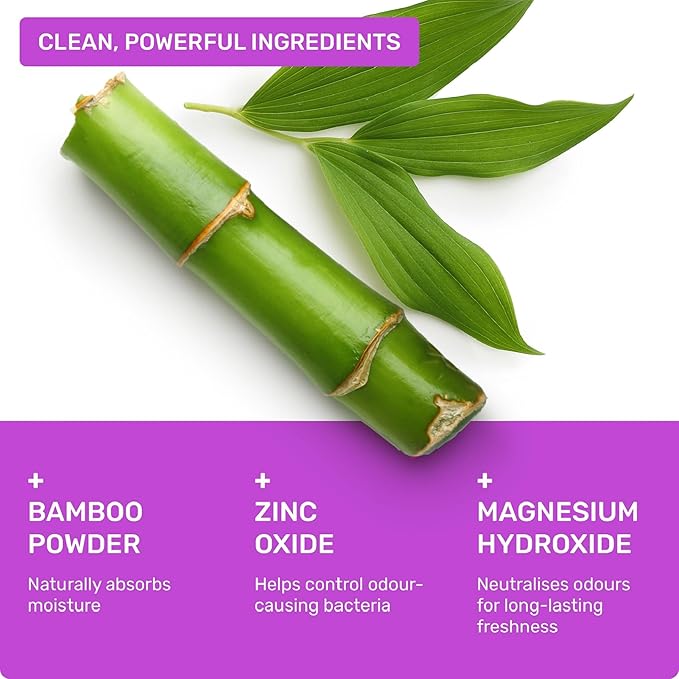 - SCIENTIFICALLY FORMULATED: Zinc oxide and magnesium hydroxide help prevent odors caused by bacteria. Bamboo powder helps underarms feel dry, while sweet almond oil and jojoba keep underarms silky smooth.