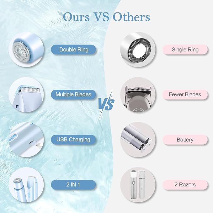 - đăSkin-Friendly DesignăThe hypoallergenic stainless steel blades of the womens electric razor provide a gentle shaving experience, and the precision-polished blades can easily shave a variety of lengths of hair, allowing you to shave faster and more carefully, reducing the risk of nicks and cuts. Enjoy silky smooth results without any irritation