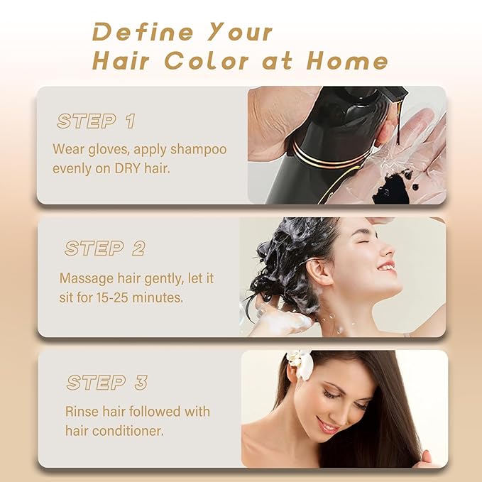 - [EASY TO USE] Tired of pre-mixing hair coloring agent? Try our instant hair dye shampoo. NO Pre-Mix! Wear gloves, apply brown hair shampoo on DYR hair, rub shampoo para pintar el cabello evenly, and let brown shampoo sit for 10-25 minutes, then rinse it. It's a Breeze to dye your hair.