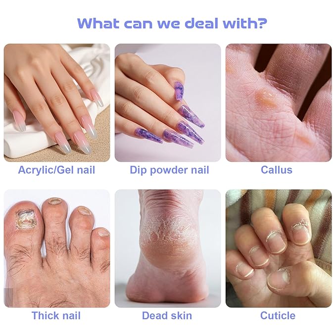 - 【3 SPEED & Dual Rotations】Experience the power of our nail file electric drill kit, featuring 3 progressive speed settings and versatile clockwise and counter-clockwise rotations. The nail dril guarantees precise filing on thick fingernails and toenails and is tailored for all skin types.