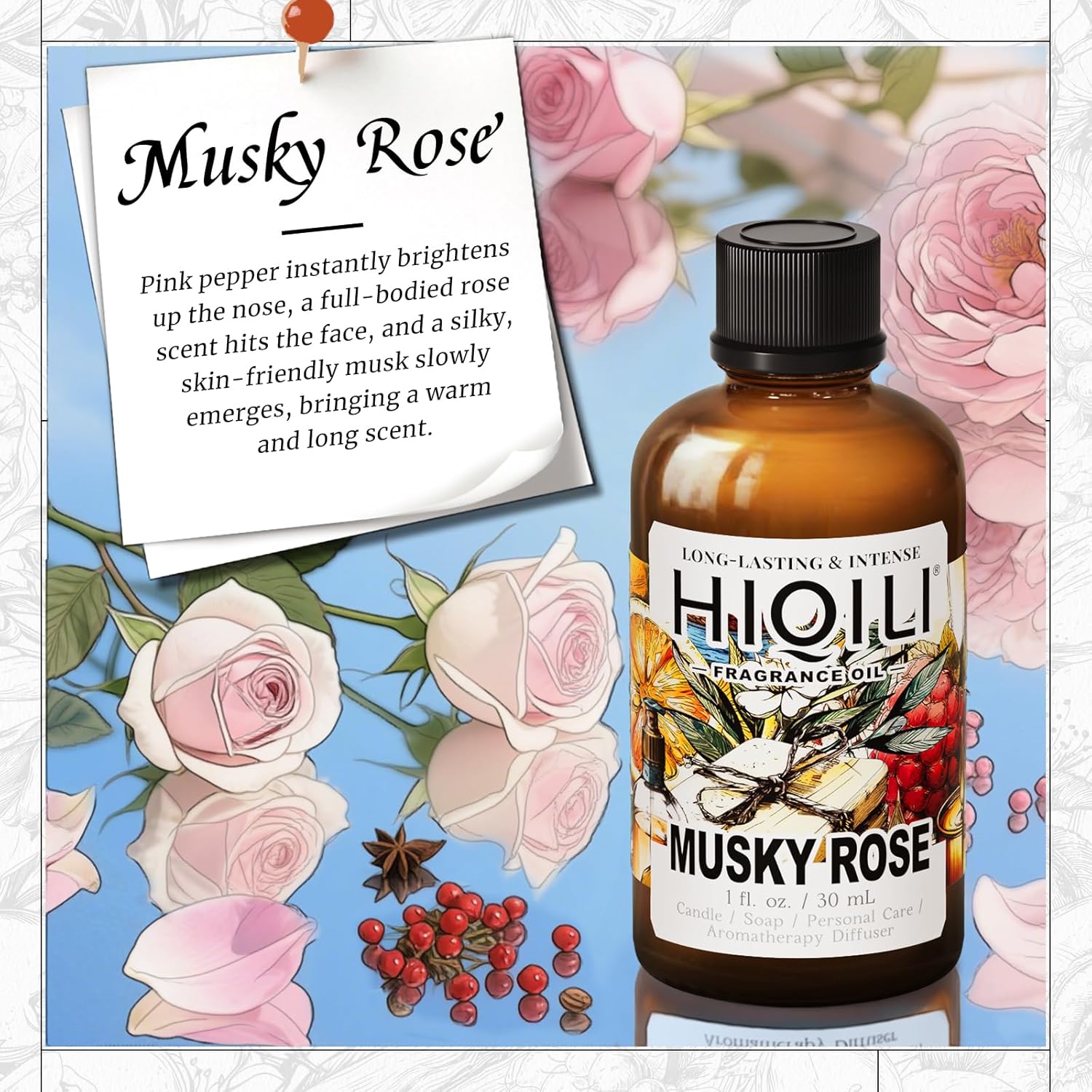 HIQILI Musky Rose Fragrance Oil for Hotel Diffuser, Luxury Scents, for Making Aromatherapy Candle, Perfume, Scented Home Decor- 1 Fl Oz